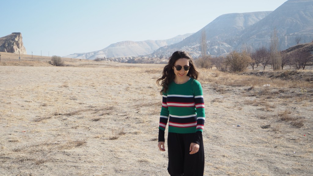Bu ilk gidişimizdi ve tarih olarak Kasım’ı seçmiştik. Sonbaharda Kapadokya’nın daha güzel olacağını düşünmüştük ki Kasım’da Kapadokya tam hayallerimdeki gibiydi. Etraf sarı tonlarda, ağaçlar yapraklarını çoktan dökmüş, el ayak çekilmiş bölge asıl sahiplerine kalmış..Hava güneşli ama soğuk. Şanslıydık ki iki gün boyunca da güneş bizi hep aydınlattı. Ama güneş gittiğinde hava dondurucu soğukluktaydı, sabah gün doğmadan ve akşam güneş battığında İç Anadolu’nun o ayazını hissediyorsunuz. Hep öğrendiğimiz o karasal iklime has gece gündüz büyük sıcaklık farklarını unutmamak üzere hatırlıyorsunuz 🙂