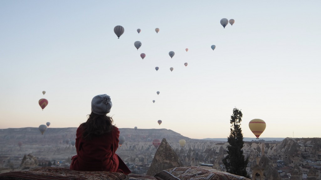 Ertesi sabah beklenen an geliyor, gün doğmadan otelin çatısında hazır bekliyoruz. Balonlar teker teker havalanmaya başlıyor, hepsi farklı farklı yönlere dağılıyor, havada rengarenkler, çocuklar gibi şeniz 🙂