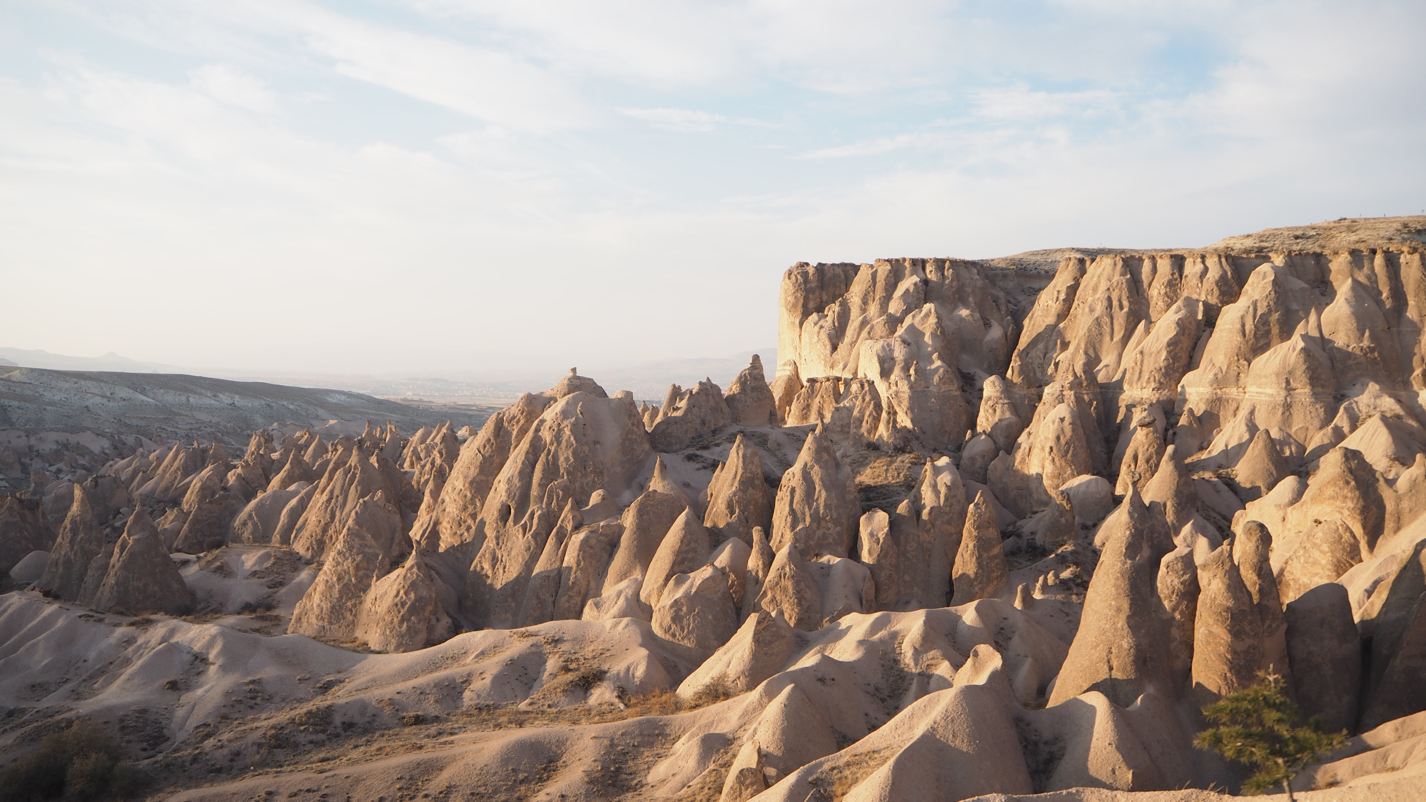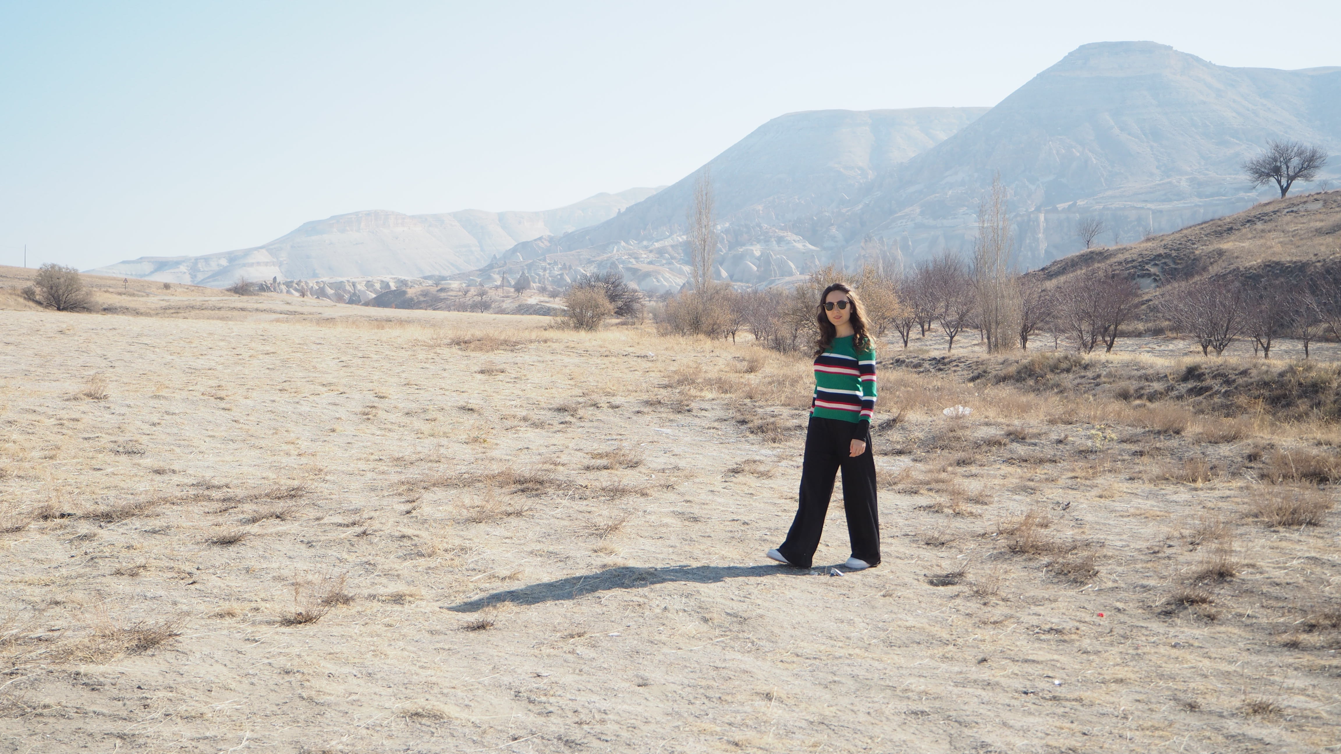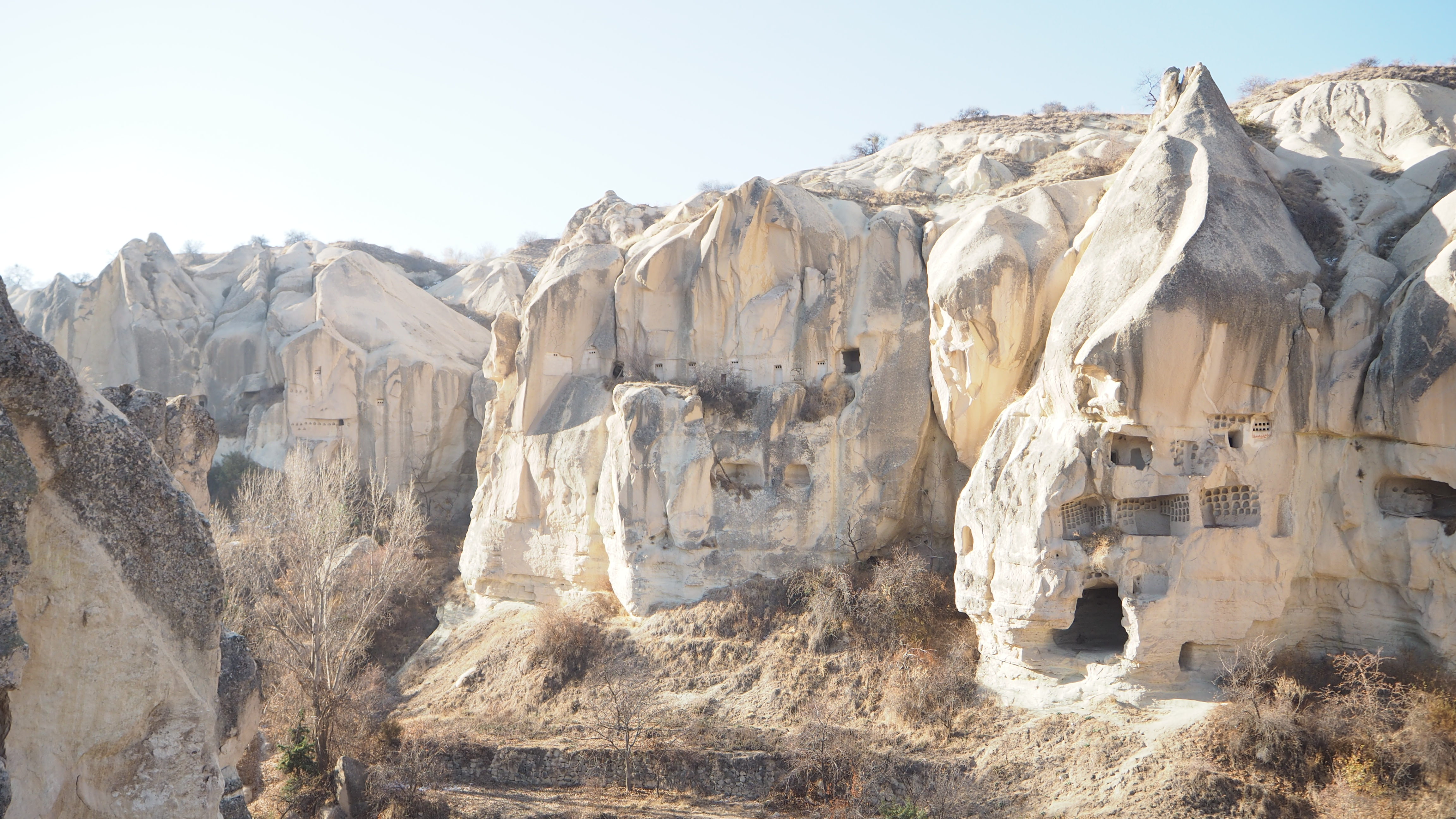 Bu ilk gidişimizdi ve tarih olarak Kasım’ı seçmiştik. Sonbaharda Kapadokya’nın daha güzel olacağını düşünmüştük ki Kasım’da Kapadokya tam hayallerimdeki gibiydi. Etraf sarı tonlarda, ağaçlar yapraklarını çoktan dökmüş, el ayak çekilmiş bölge asıl sahiplerine kalmış..Hava güneşli ama soğuk. Şanslıydık ki iki gün boyunca da güneş bizi hep aydınlattı. Ama güneş gittiğinde hava dondurucu soğukluktaydı, sabah gün doğmadan ve akşam güneş battığında İç Anadolu’nun o ayazını hissediyorsunuz. Hep öğrendiğimiz o karasal iklime has gece gündüz büyük sıcaklık farklarını unutmamak üzere hatırlıyorsunuz 🙂