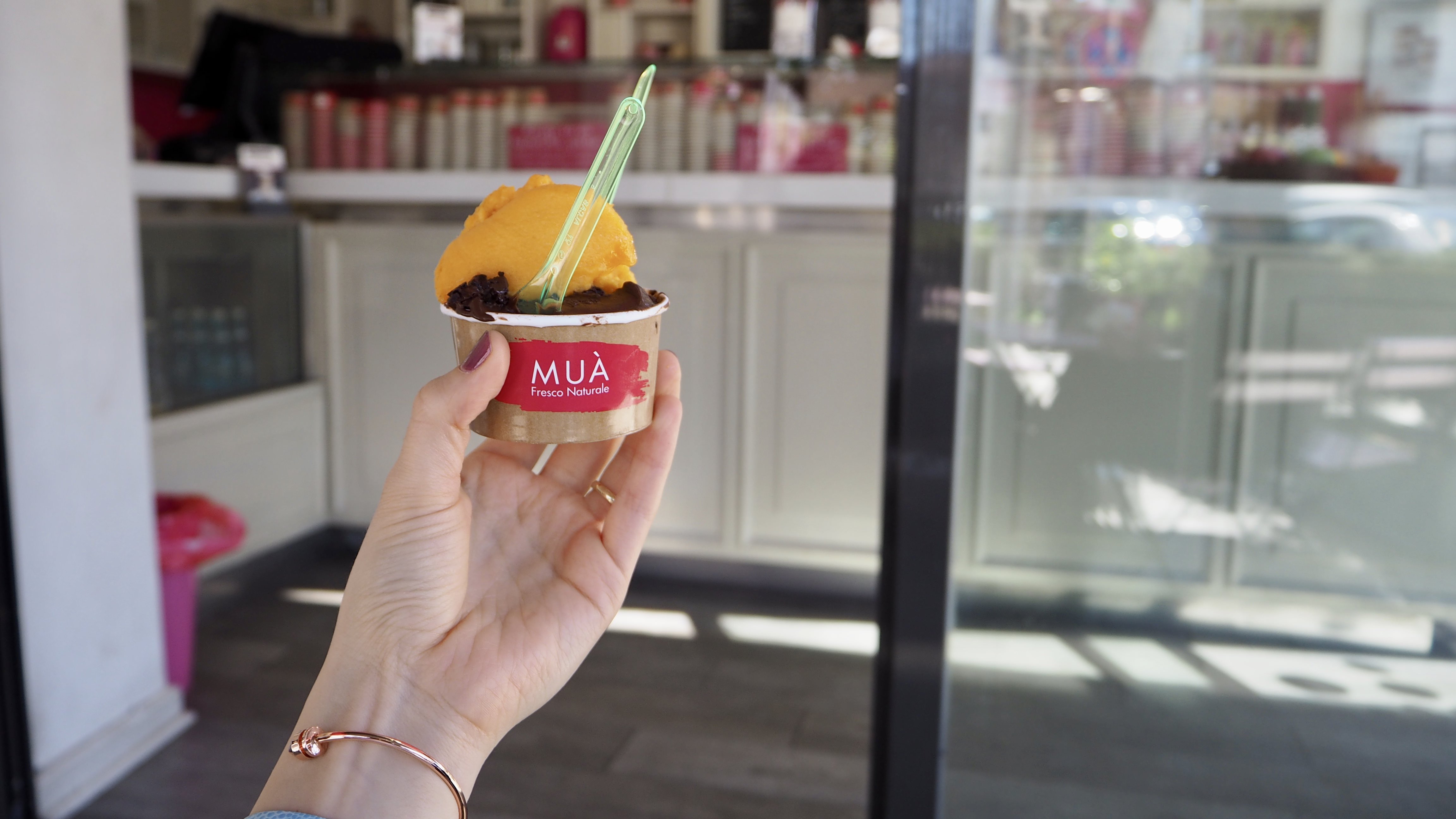 İtalyanca derslerinde aklıma kazınan bir kelime varsa o da ‘gelato’dur. Hiç kaçırmam, gözlerim radar gibidir, içinde gelato olanı hemen seçer 😀 Çünkü dondurmaya bayılırım, arama hiç mesafe koyamam, sınırım da yoktur istediğim kadar yerim. Tabi söylediklerim paketli hazır dondurmalar için geçerli değil, onları dondurma olarak değil bir çeşit tatlı olarak görürüm. Yemeyeli de baya olmuştur. Yazlık yerlerde kendi yapıp satan dondurmacıların keyfini bir yana koyarsak, Mua’da yapay renklendirici, koruyucu, tatlandırıcı içermemesi ile benim gönlümü çalmıştı.
